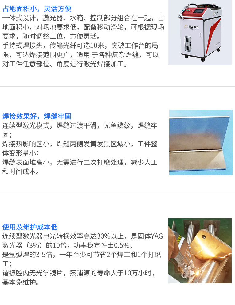通發(fā)激光一體式手持式激光焊接機,用手持式焊接槍替代以前固定光路,手拿焊接,靈活方便,焊接距離更長,克服工作臺空間的局限性,工件尺寸不統(tǒng)一時無法自動焊接的情況下使用。主要針對大型工件、固定位置如內(nèi)直角、外直角、平面焊縫焊接、焊接時熱影響區(qū)域小,變形小、而且焊接深度大,焊接牢固。是遠(yuǎn)距離焊接大工件的較為靈活的全新的焊接工藝。