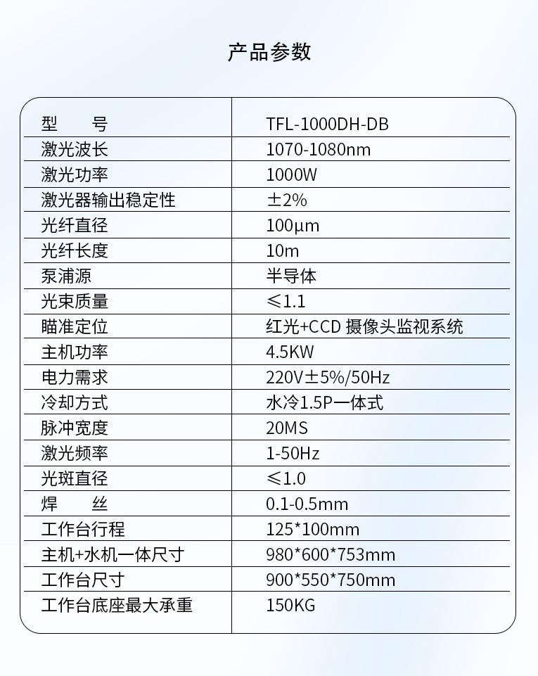 采用光纖激光器,反射率高,能量強(qiáng),免維護(hù),免調(diào)光,功耗少,相比傳統(tǒng) 模具焊來說,體積小,安全,穩(wěn)定性好超長(zhǎng)使用壽命。 1000W光纖激光器,滿足銅、鋁焊接量大的模具及產(chǎn)品焊接加工需要。 高承重底座及工作臺(tái),保持輕便靈活的優(yōu)點(diǎn),同時(shí)提供更高承載能力。 配備.1.5P大功率一體式水冷水機(jī),保證了大功率焊接的穩(wěn)定性。
